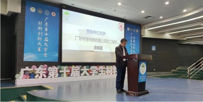 公司總工程師余總作為公司代表進(jìn)行講話,余總首先對(duì)本次材料創(chuàng)新大賽的成功舉辦和獲獎(jiǎng)的大學(xué)生表示了祝賀,鼓勵(lì)大學(xué)生未來(lái)可以研究出更多具有實(shí)際價(jià)值的創(chuàng)新性科學(xué)成果,并在科研的道路上不斷進(jìn)取、勇攀高峰。同時(shí)也感謝廣東工業(yè)大學(xué)對(duì)中寶電纜的信任,邀請(qǐng)我們作為本屆大賽的贊助商,共同合作舉辦此次大賽,共同促進(jìn)教育科研事業(yè)健康發(fā)展,公司熱心公益、關(guān)注社會(huì)、關(guān)愛大學(xué)生,支持大賽舉辦是公司回饋社會(huì)的體現(xiàn)。